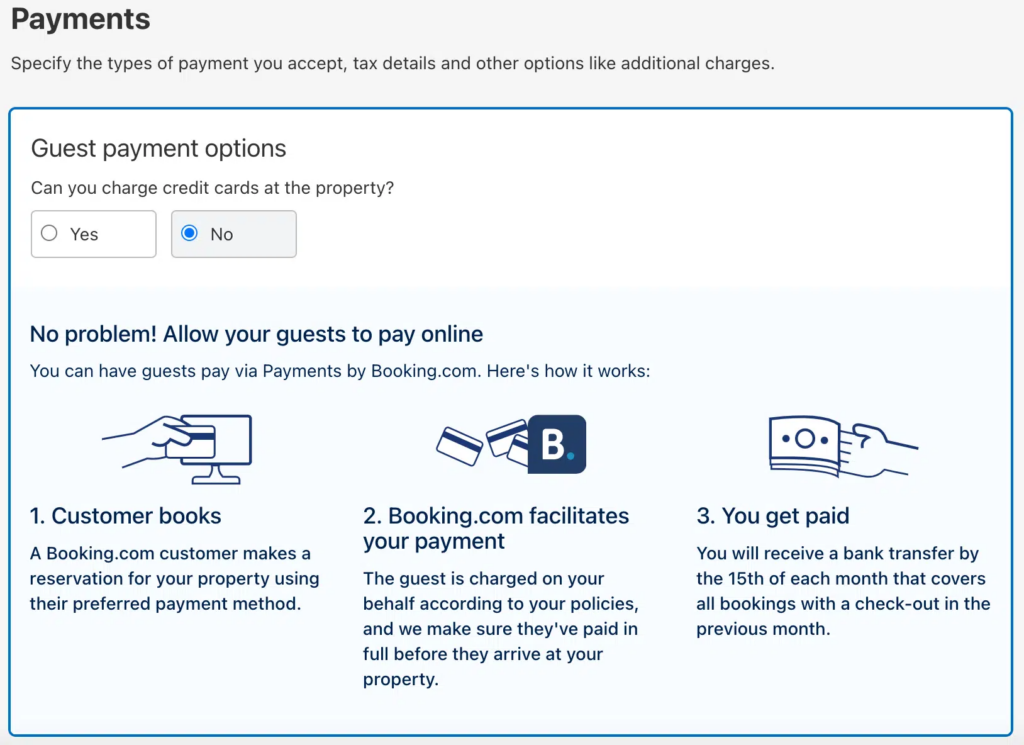 Then we come to the final step in the process: adding your preferred methods of payment. You can choose to either have Booking.com handle the credit card payment, or have guests pay directly with you, after which you’ll pay Booking.com their commission. You can also nominate which of the major credit cards you accept.