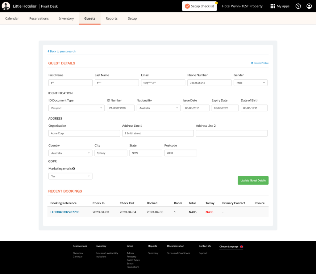 However, at small accommodations, guest profiles will be what you use the most in your day-to-day property management. Here’s an example from Little Hotelier’s platform to show you how it looks from your perspective: