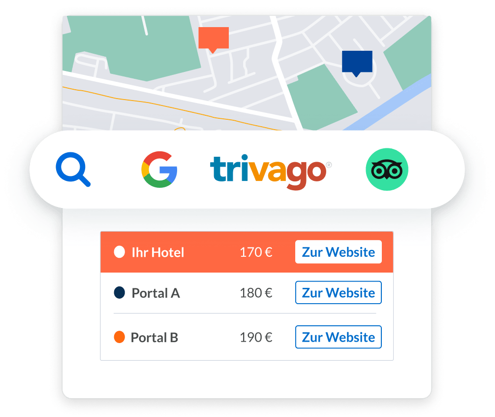 Ein Service, um Ihre Unterkunft auf Google Hotel Ads, Trivago und TripAdvisor zu bewerben, um mehr Direktbuchungen auf Ihre Website zu lenken.