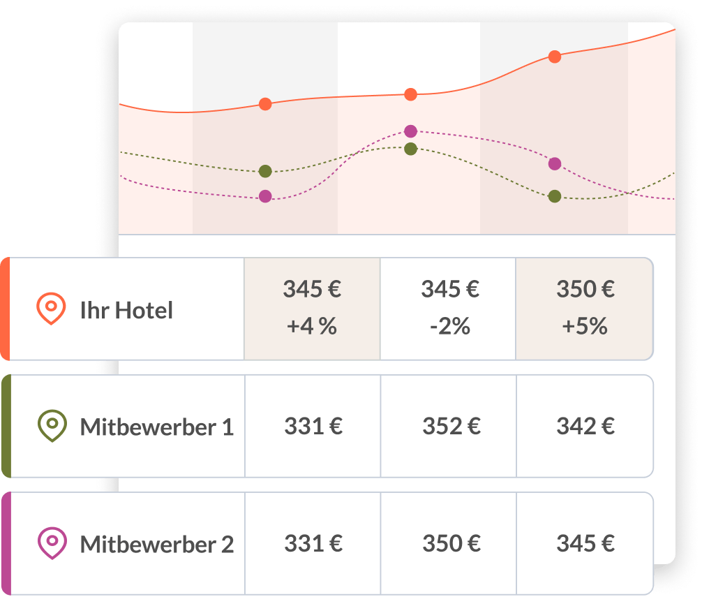 - Business Intelligence: Behalten Sie die lokale Marktlage und Ihre Konkurrenz im Auge. Auch Ihre Raten und die Leistung Ihrer verknüpften Buchungskanäle lassen sich messen.