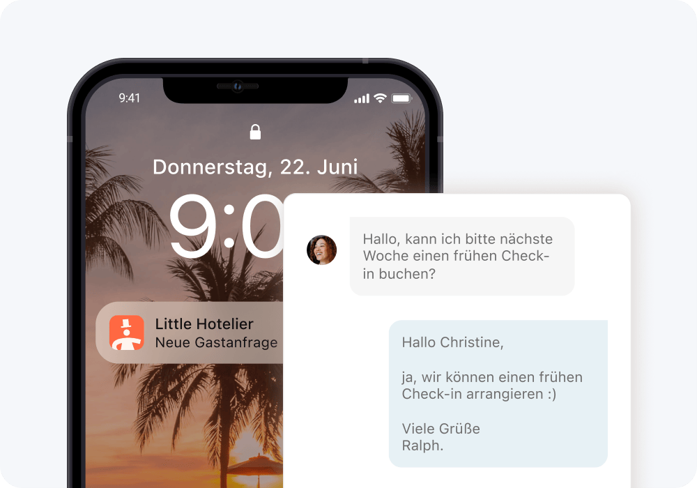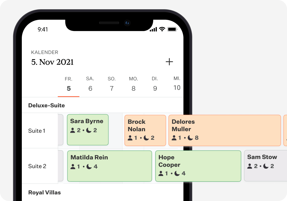Es handelt sich dabei um eine App für Smartphones und Tablets, die die Verwaltung von kleinen Unterkünften erleichtert und Ihre Betriebsabläufe optimiert – perfekt für unterwegs. Sie können problemlos Gäste ein- und auschecken, Buchungen verwalten und Zimmer zuweisen, jederzeit und überall. Sie brauchen dafür nur Zugang zum Internet.