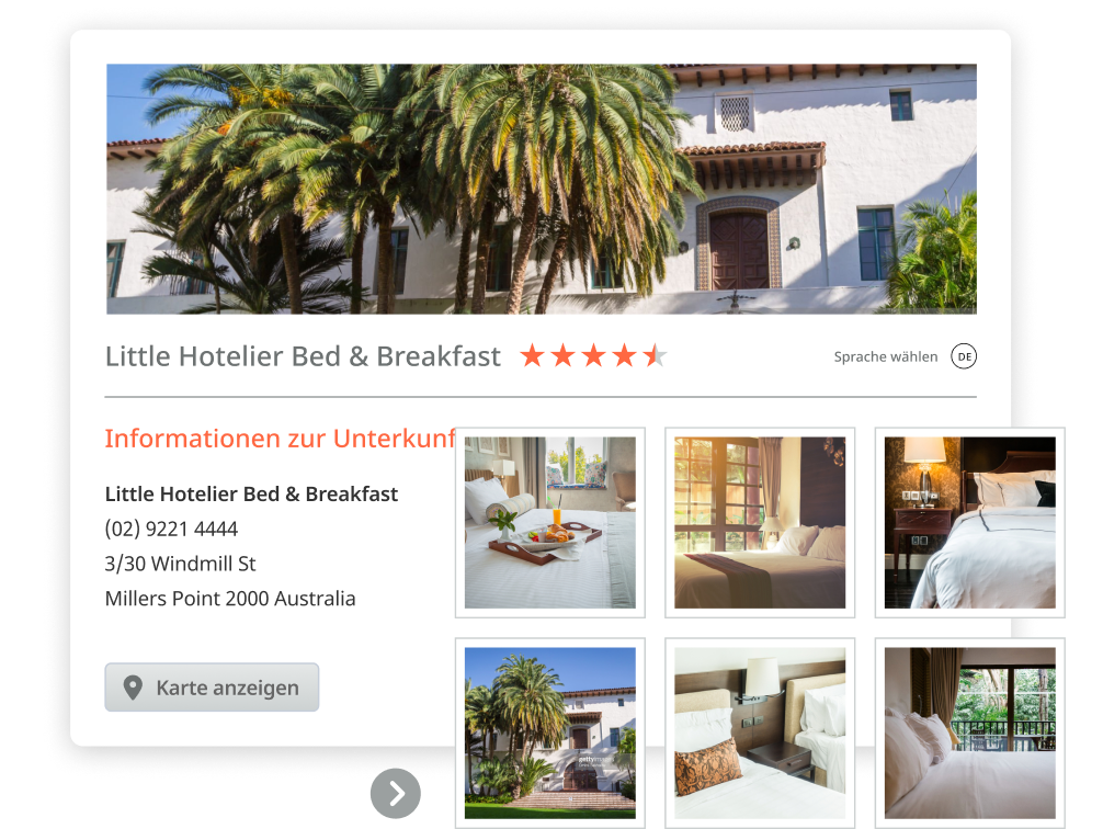 Einige spezielle Webseiten-Gestalter richten sich sogar explizit an Inhaber*innen kleiner Unterkünfte. Little Hotelier zum Beispiel vereinfacht die Erstellung von Websites für Unterkünfte erheblich, indem der Webseiten-Gestalter eine Reihe von Vorlagen bietet, die Best Practices der Branche folgen. Alle Aktualisierungen werden im Back-End automatisch durchgeführt, ohne dass Sie eingreifen müssen.. All updates are done on the backend automatically, with nothing further needed from you.