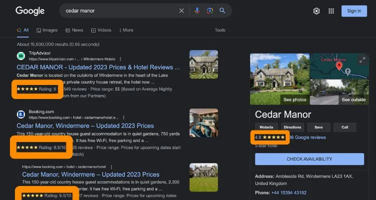 Tener una clasificación por estrellas en cualquier plataforma -ya sea una clasificación con revisión oficial proporcionada por un organismo del sector, o un sistema de clasificación generado automáticamente a partir de las opiniones de los clientes (piensa en las opiniones de Google)- ayuda a los huéspedes a saber fácilmente qué pueden esperar de tu hotel en cuanto a su servicio y costes.