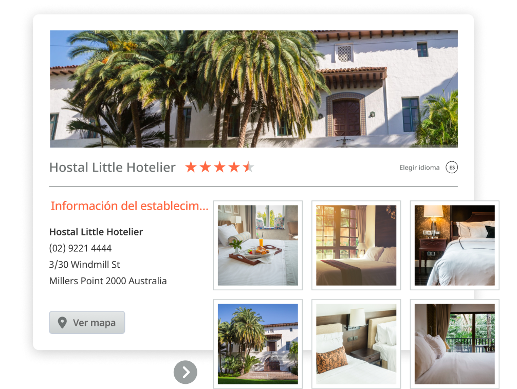Es fundamental tener fotografías de alta calidad del establecimiento, las habitaciones y los servicios. Esto es especialmente importante en el caso de los pequeños hoteles independientes u hostales, ya que dependen en gran medida del aspecto visual para atraer a posibles huéspedes. Además, ofrecer descripciones detalladas de cada tipo de habitación y de los servicios exclusivos les ayudará a ver lo que ofreces. Asegúrate también de incluir dónde se encuentra el establecimiento, cómo llegar allí y qué hay cerca, con una dirección precisa, indicaciones y un mapa. No olvides destacar los lugares de interés de la zona, como restaurantes populares, parques y museos, para ayudar a los huéspedes a planificar su estancia y aumentar las probabilidades de que hagan una reserva en tu alojamiento. Otro contenido esencial serían políticas y procedimientos claros, para que puedas establecer las expectativas de los huéspedes y evitar malentendidos. Incluye tu política de cancelación, horarios de entrada y salida, políticas sobre mascotas y otras pautas de comportamiento en tu establecimiento.