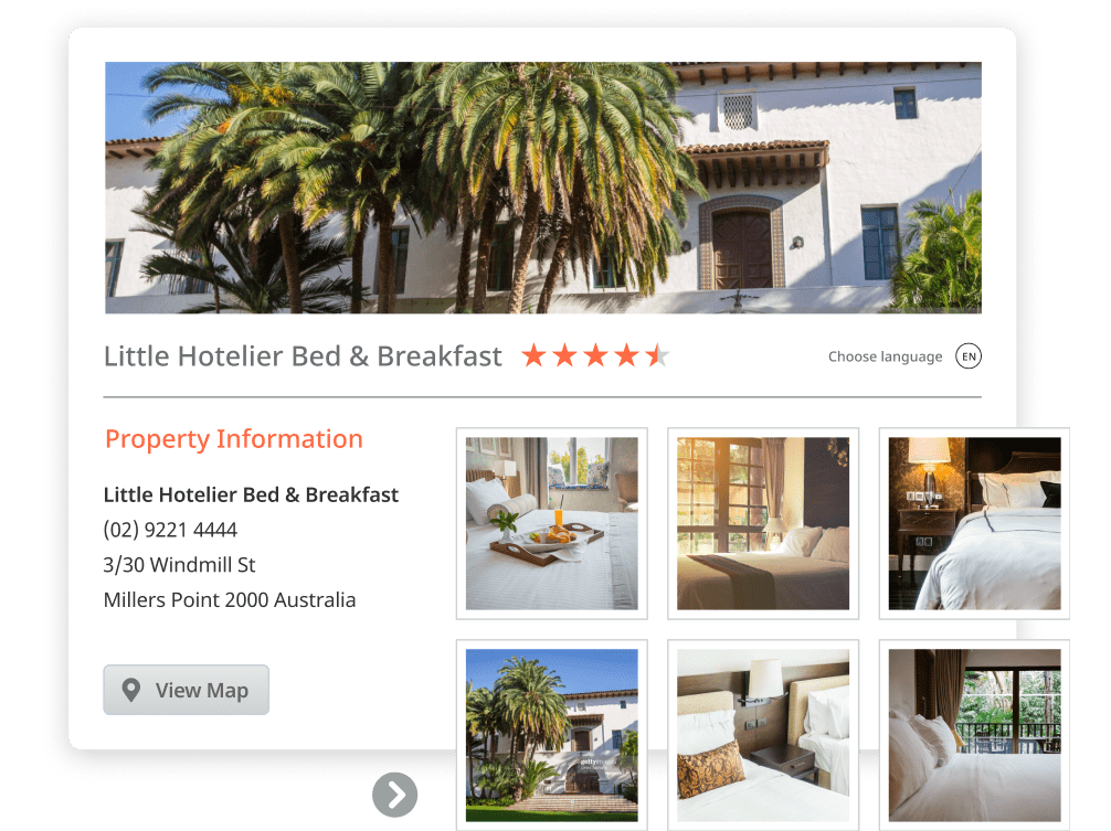 Just want to get online quickly and easily? No worries. We have a simple direct booking webpage that lets you make key updates to your brand, with essentials like photos, room descriptions and cancellation policies — so you can get online and be visible fast. Or you can upgrade to one of our more advanced website designs, and showcase everything your hotel has to offer, with customisable features. The choice is yours.