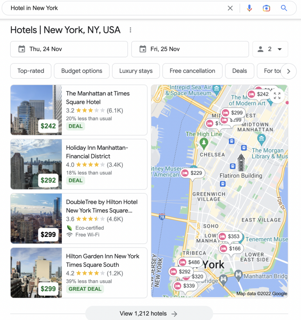 Namun, Google Hotel Ads adalah cara bagi properti Anda untuk menonjol di antara keramaian, unggul dari pesaing terdekat Anda, serta memastikan wisatawan tidak melewatkan penawaran Anda. Cara ini efektif untuk meningkatkan visibilitas properti Anda di mata wisatawan, menunjukkan kepada tamu apa yang Anda tawarkan, dan meningkatkan kemampuan Anda untuk melakukan penjualan tambahan.