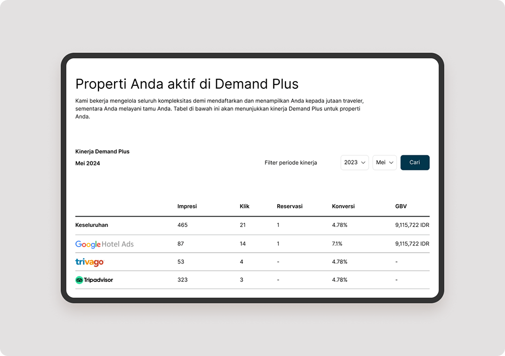 Layanan promosi properti di Google Hotel Ads, Trivago, dan TripAdvisor sehingga Anda dapat mengarahkan lebih banyak pemesanan langsung ke situs