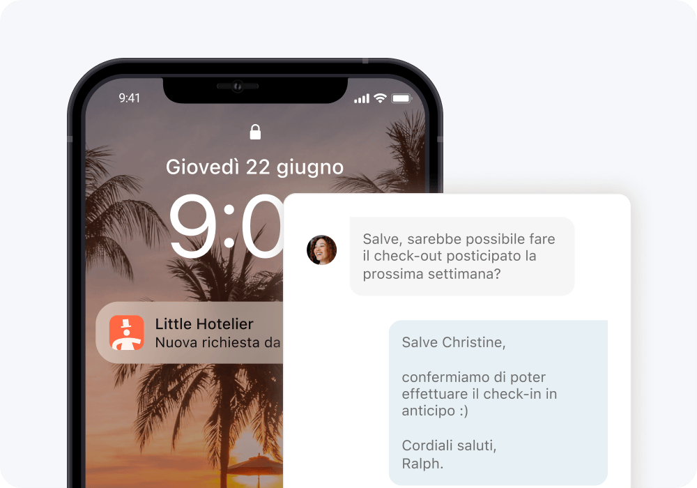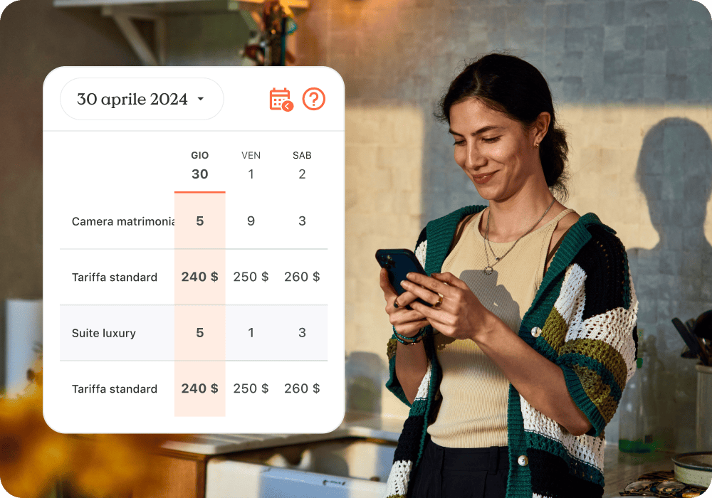 Tieniti al corrente di cosa succede e quando succede. Ricevi notifiche per nuove prenotazioni, arrivi e partenze, oltre a suggerimenti sui prezzi in tempo reale, per controllare l’andamento della tua struttura in qualsiasi luogo e momento.