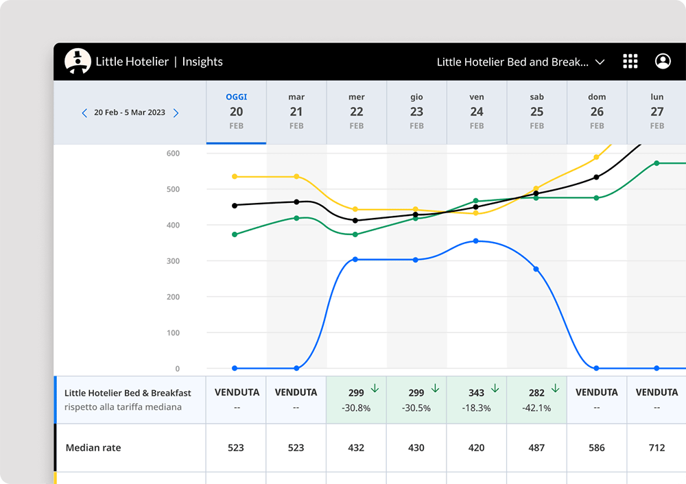 - Ottimizza i prezzi: Visualizza entrate e performance per piano tariffario e tipo di camera.