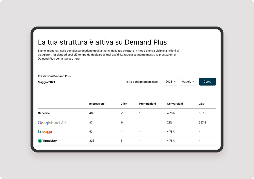 - Oltre 450 canali di distribuzione: Promuovi la tua struttura simultaneamente su canali di prenotazione OTA e piattaforme di Metasearch come Google Hotel Ads, Trivago e Tripadvisor.