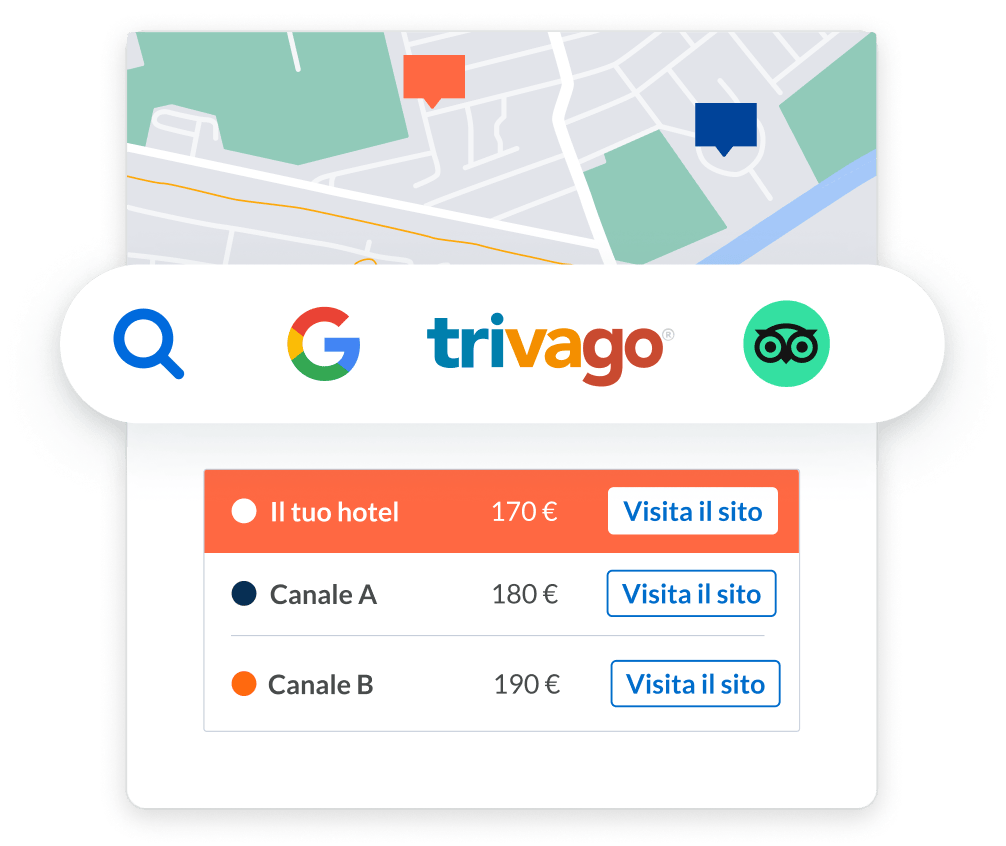 - Accedi ai Metasearch: Appari su Google, Trivago e Tripadvisor per guidare il traffico verso il tuo Motore di Prenotazione Diretta.
