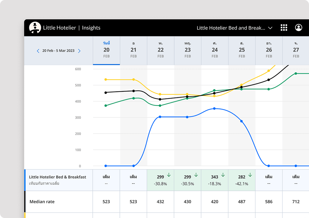 - ระบบรายงานอัจฉริยะ: ติดตามตลาดในประเทศ คู่แข่งของคุณ และคอยตรวจสอบราคาและผลประกอบการของคุณในช่องทางการจองต่างๆ ที่เชื่อมต่ออยู่